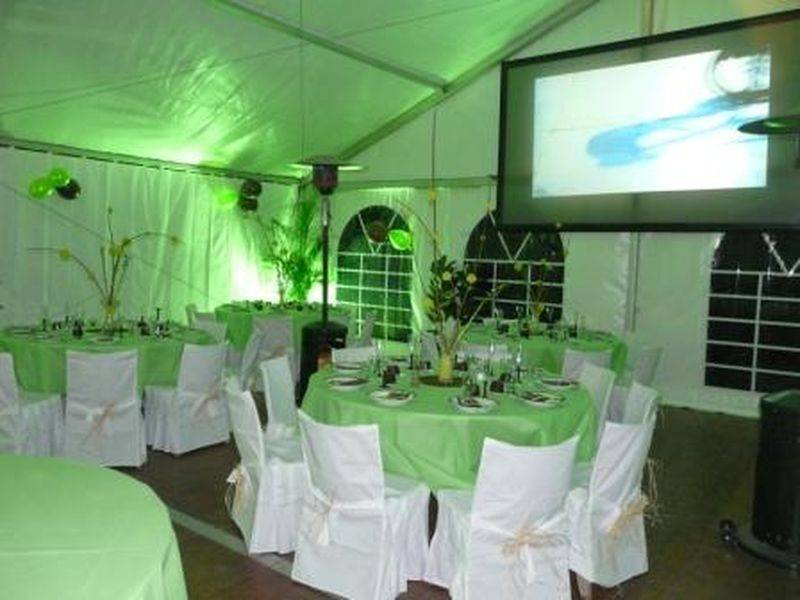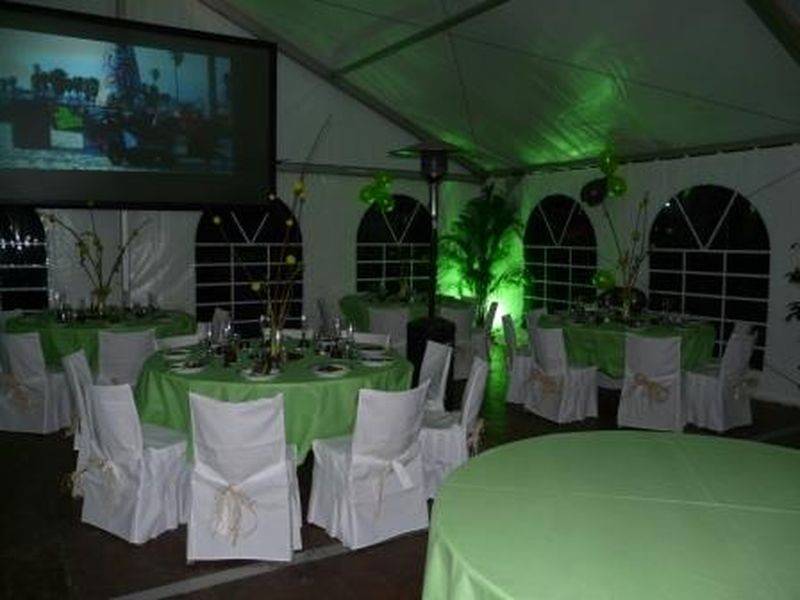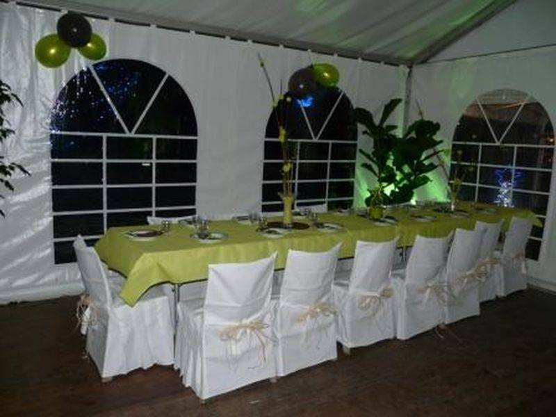 Location de tente pour un anniversaire. Structure de 10x10 soit 100m² avec plancher, Eclairage, Chauffage et Office de 18m².